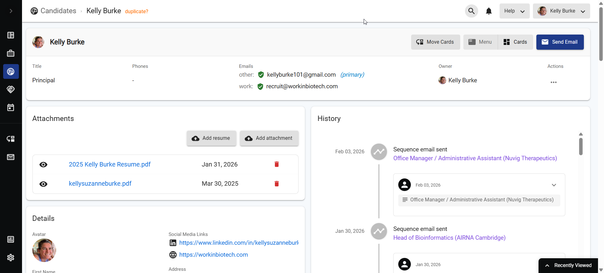 | Candidate history and email threads | ||