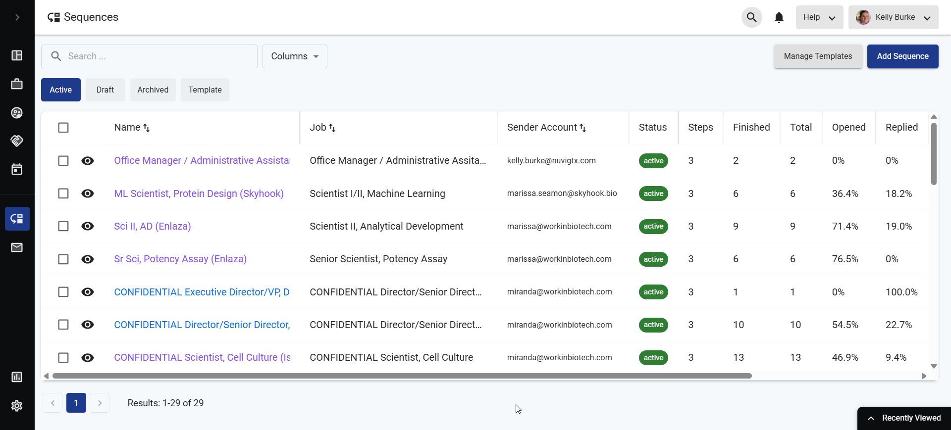 | Activity logs and analytics for Candidates, Jobs, Clients, Sequences | ||
